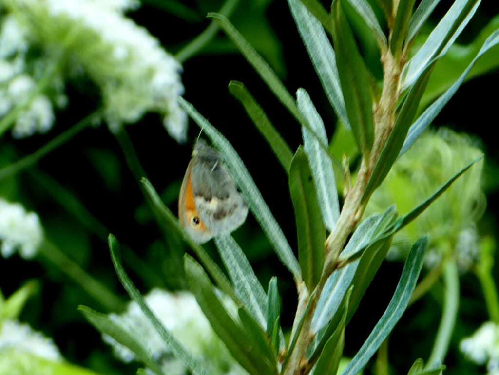 Nach meinen Beobachtungen war 2023, was Artenanzahl und Häufigkeit der Tagfalter anbelangt, ein durchwachsenes Jahr. Einerseits war die Anzahl der Falter spürbar gering (dies berichteten auch andere Gartenfreunde), andererseits war es ein erfreuliches Jahr hinsichtlich der Artenvielfalt. Dies wurde auch bei bundesweiten Falterbeobachtungen festgestellt. Insgesamt 19 Tagfalterarten habe ich in meinem Garten (Hornstückenweg 26) dokumentiert, darunter erstmalig am 29.07.23 (siehe Foto) eine zuvor nicht beobachtete Art, das Kleine Wiesenvögelchen (Coenonympha pamphilus).