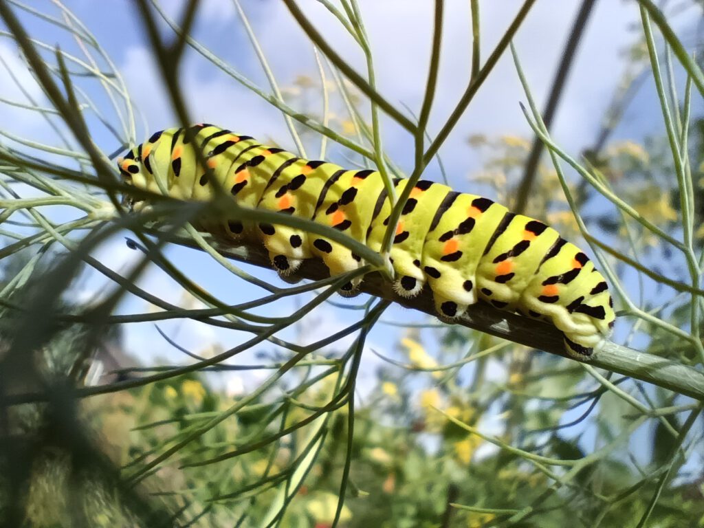 Auch Anja Albers fand am 03.09.23 in ihrem Garten (Kälberkampsweg 6) wieder Raupen vom Schwalbenschwanz. Die 4 Raupen waren noch recht klein (2-3 cm) und befanden sich auf Dillpflanzen genau an derselben Stelle, wo Anja auch im Vorjahr (30.08.22) Raupen vom Schwalbenschwanz entdeckt hatte (vgl. Fotos).