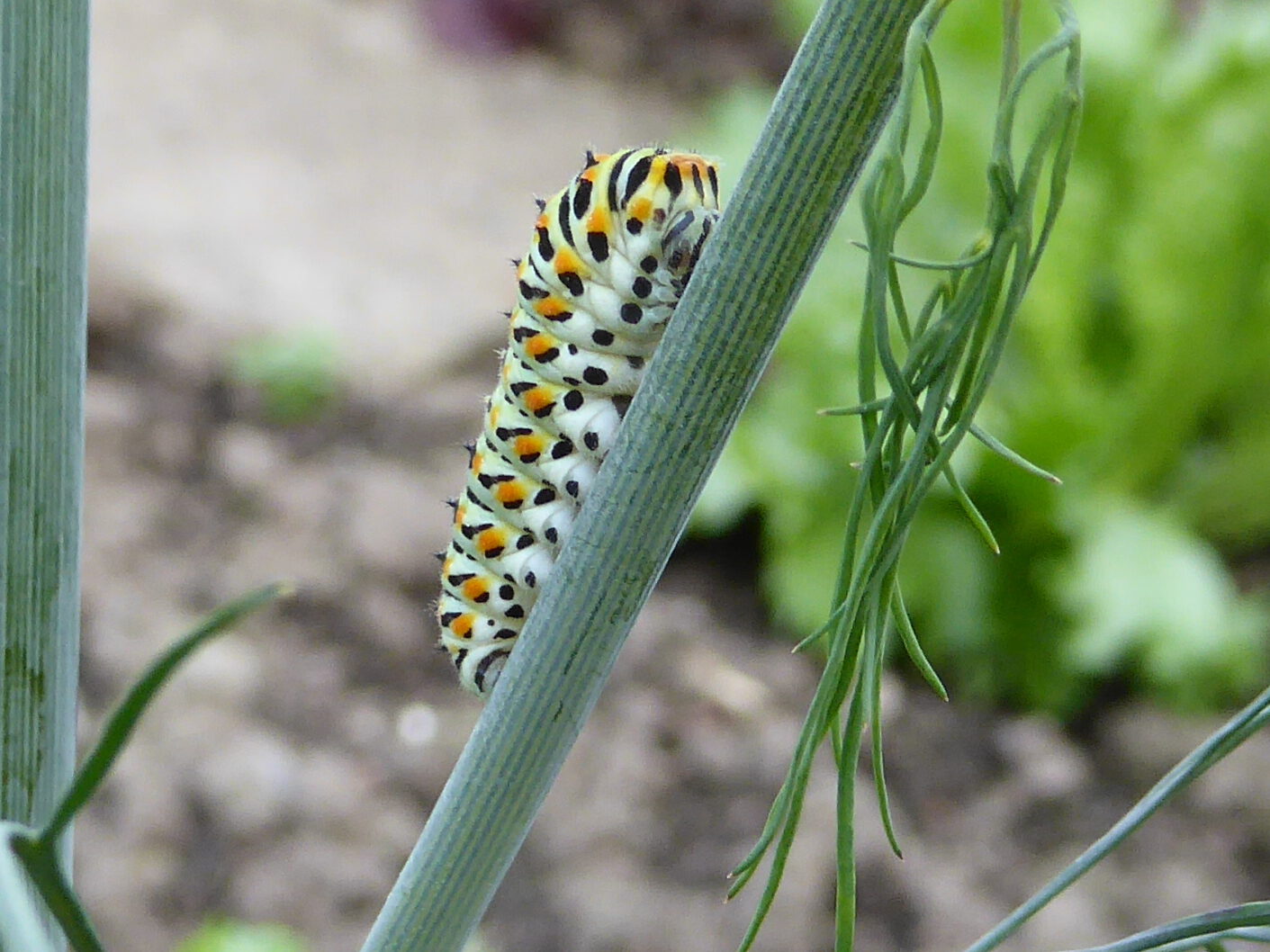 Fotos (K.K.): Raupen vom Schwalbenschwanz auf Dill im Kälberkampsweg 6 am 03.09.23.