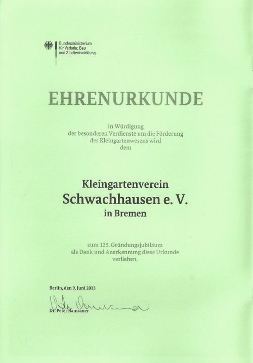 Die zweite Urkunde wurde mit folgendem Inhalt überreicht: „Auf Antrag des Preisrichterkollegiums der Ausstellung des Verbandes Bremischer Kleingartenvereine e.V. vom 21. bis 24. August 1926 wird hiermit für hervorragende Leistungen auf dem Gebiete des Kleingartenwesens dem Gartenbauverein Schwachhausen die Goldene Medaille des Reichsverbandes der Kleingärtnervereine Deutschlands verliehen.“